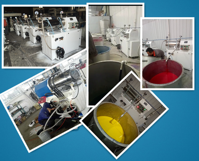 臥式密閉砂磨機是一種采用濕法研磨分散、筒體水平安裝、連續(xù)密閉生產的化工設備;型氣動雙隔膜泵(或齒輪泵)將經過預分散、潤濕處理的固液相混合物料輸入筒體內,物料和筒體內的研磨介質一起被高速旋轉的分散器組所攪動,使物料中的固體顆粒和研磨介質間產生強烈的碰撞、剪切,在短時間內達到物料顆粒的磨細和分散聚集體的目的。是生產油漆、油墨、染料等產品的常用設備